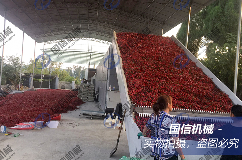 這種大型辣椒烘干機(jī)是采用多層網(wǎng)帶【一般為4層,也根據(jù)客戶需求進(jìn)行定制】在烘箱內(nèi)呈“S”型運(yùn)動(dòng),帶動(dòng)辣椒在烘箱不停的運(yùn)動(dòng),從上層網(wǎng)帶掉落至下層網(wǎng)帶,熱空氣從最下層進(jìn)入烘箱,逐層穿透網(wǎng)帶和辣椒,最終從烘箱的上方將濕氣帶出烘箱,達(dá)到辣椒最終烘干的過(guò)程。熱空氣在烘箱內(nèi)與辣椒接觸的時(shí)間極短,不會(huì)影響到辣椒的顏色問(wèn)題。因?yàn)槭沁B續(xù)式烘干,所以烘干產(chǎn)量比較大,適用于較大產(chǎn)量的辣椒烘干作業(yè),烘干速度快,生產(chǎn)效率高,受到了市場(chǎng)的一致肯定與歡迎。